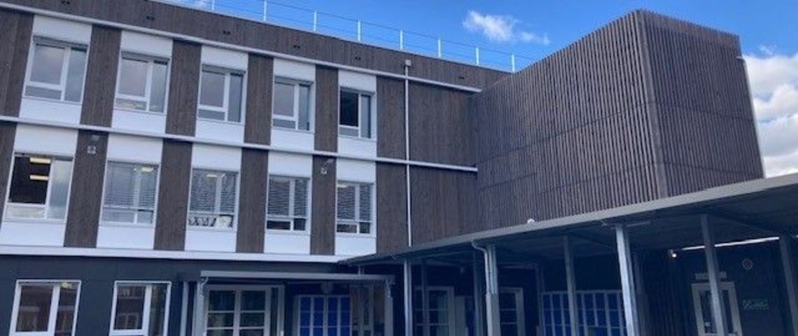 Bâtiment enseignement: préfabriqué 3D en CLT, ITE LDR, Bardage bois, BSO généralisé.